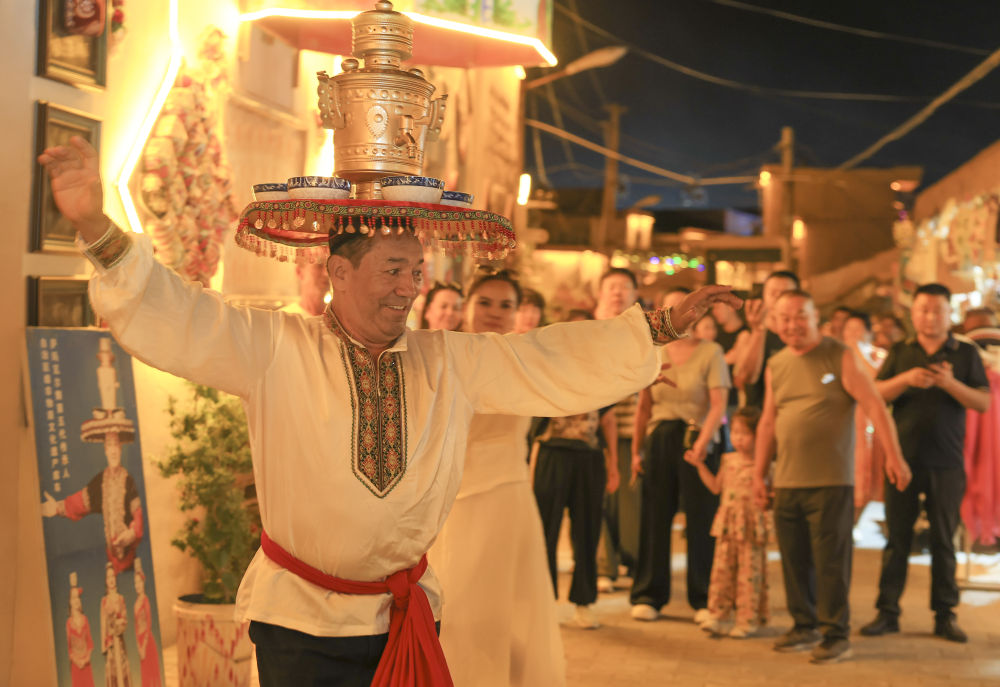 夜幕降臨,煙火氣息在庫(kù)車?yán)铣菑浡?。廣場(chǎng)上傳來(lái)歡快的樂(lè)曲聲,舞者頭頂銅盤銅壺,腳步輕快,將迎賓之禮——薩瑪瓦爾舞展現(xiàn)在游客面前,掌聲與歡笑聲此起彼伏。