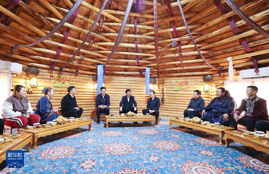 9月27日,受習(xí)近平總書(shū)記囑托,中共中央政治局常委、全國(guó)政協(xié)主席、中央代表團(tuán)團(tuán)長(zhǎng)王滬寧帶領(lǐng)中央代表團(tuán)部分成員到阿勒泰地區(qū)布爾津縣考察。這是王滬寧和中央代表團(tuán)部分成員在扎拉特鄉(xiāng)村旅游專業(yè)合作社同村民交流。新華社記者 姚大偉 攝