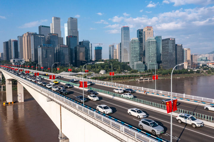 2025年10月1日,車輛行駛在掛滿國旗的重慶黃花園嘉陵江大橋上(無人機(jī)照片)。新華社記者 黃偉 攝