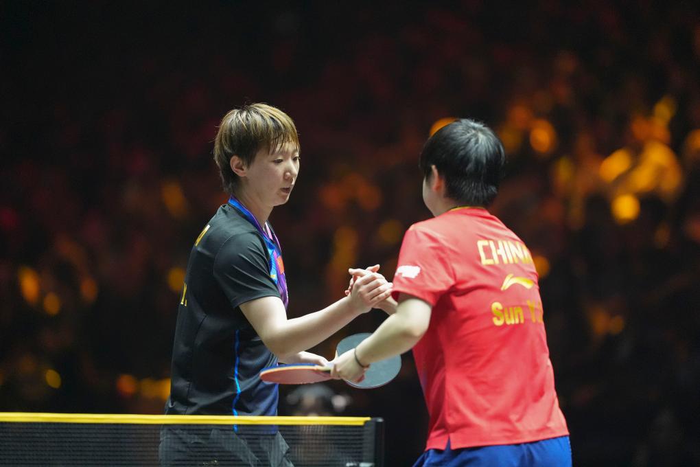 10月5日,王曼昱(左)獲勝后與孫穎莎握手致意。新華社記者 謝晗 攝