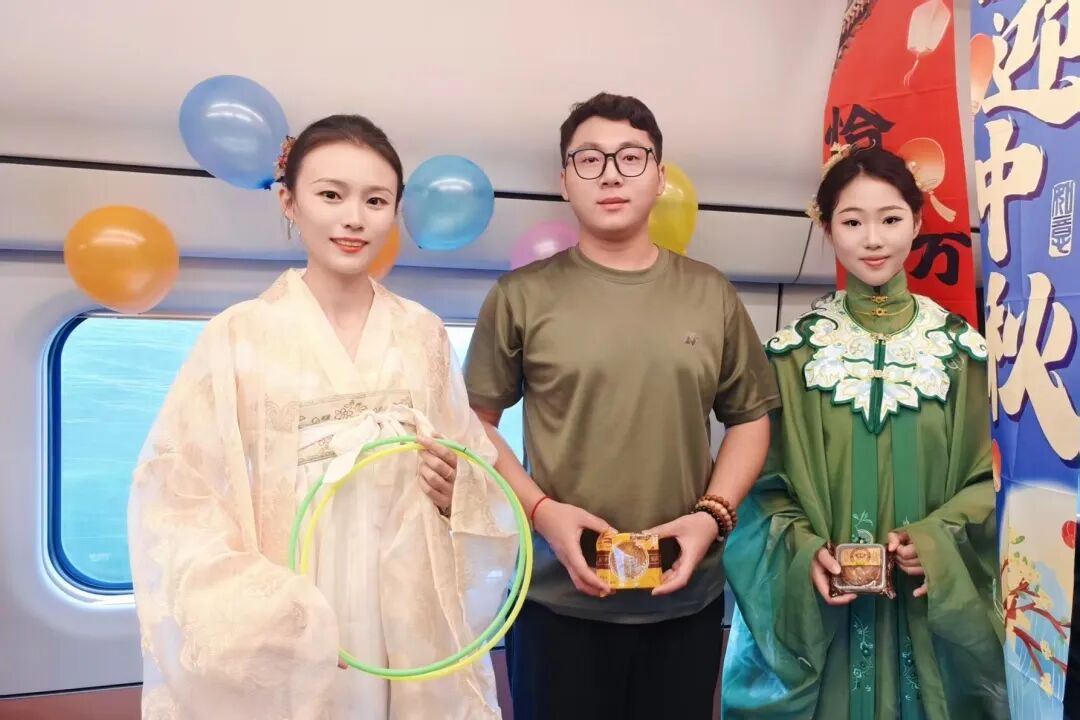 車廂內(nèi),懸掛的燈籠點綴出濃濃節(jié)日氣息。青年職工演唱歌曲《看月亮爬上來》,熟悉的旋律引發(fā)旅客共鳴;“舉頭望明月(打一中藥名)”等趣味猜燈謎活動,吸引不少旅客踴躍參與;身著漢服的乘務(wù)員帶領(lǐng)孩子們玩起傳統(tǒng)套圈游戲,月餅、玩偶作獎品,歡聲笑語不斷。