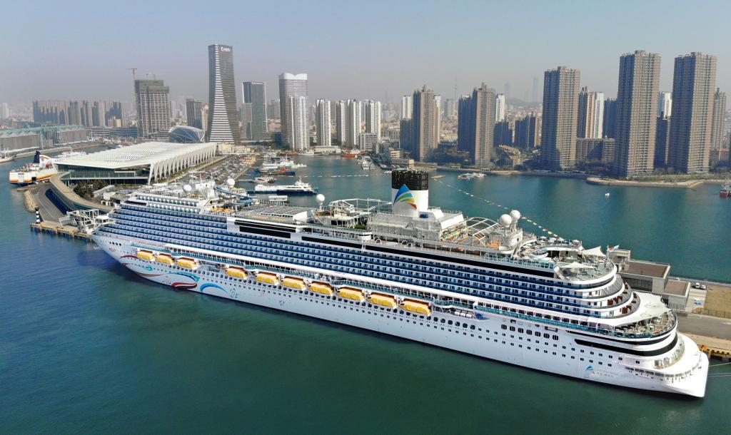 “愛(ài)達(dá)·魔都號(hào)”郵輪靠泊在青島郵輪母港碼頭(無(wú)人機(jī)照片)。新華社記者 李紫恒 攝