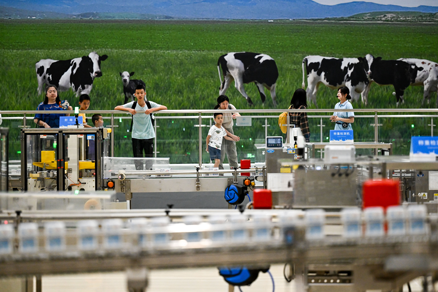 2025年7月28日,游客在呼和浩特市伊利現(xiàn)代智慧健康谷液態(tài)奶全球智造標(biāo)桿基地參觀。新華社記者 李志鵬 攝