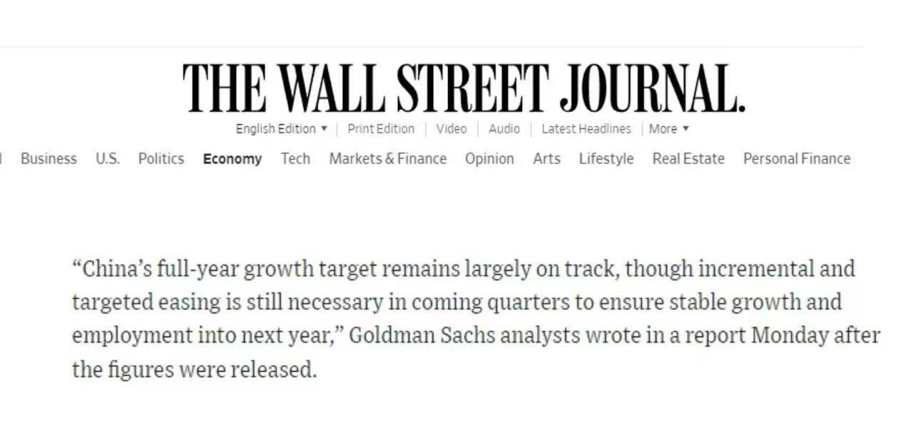 美國(guó)《華爾街日?qǐng)?bào)》報(bào)道顯示,2023年前三季度中國(guó)GDP同比增長(zhǎng)5.2%,意味著"5%左右"的年度增長(zhǎng)目標(biāo)已基本達(dá)成。報(bào)道援引高盛分析師觀點(diǎn)稱,雖然未來(lái)幾個(gè)季度仍需實(shí)施漸進(jìn)式、結(jié)構(gòu)性的寬松政策,但全年經(jīng)濟(jì)增速仍將總體符合預(yù)期。