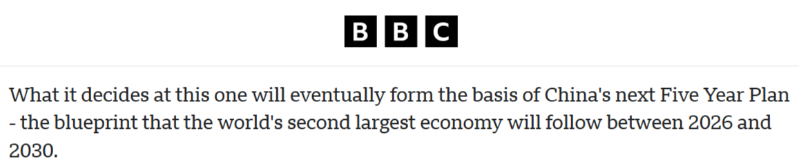 10月20日至23日,黨的二十屆四中全會(huì)在北京舉行。對(duì)此,英國(guó)廣播公司(BBC)19日?qǐng)?bào)道認(rèn)為,“此次會(huì)議所作的決定最終將成為中國(guó)下一個(gè)五年規(guī)劃的基礎(chǔ),而這一規(guī)劃將指引世界第二大經(jīng)濟(jì)體在2026年至2030年期間的發(fā)展方向”。