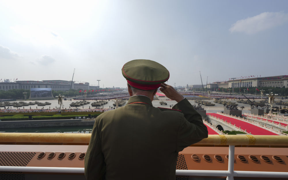 9月3日,紀(jì)念中國人民抗日戰(zhàn)爭暨世界反法西斯戰(zhàn)爭勝利80周年大會在北京隆重舉行。這是觀禮嘉賓在天安門城樓上敬禮。新華社記者 才揚(yáng) 攝