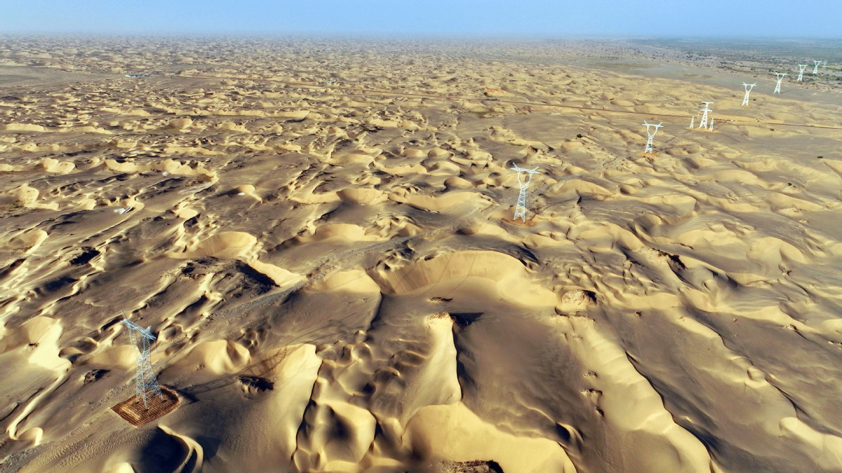 2025年6月25日,民豐—且末—若羌750千伏輸電線路工程穿越“死亡之?!彼死敻缮衬?。(馬元 攝)