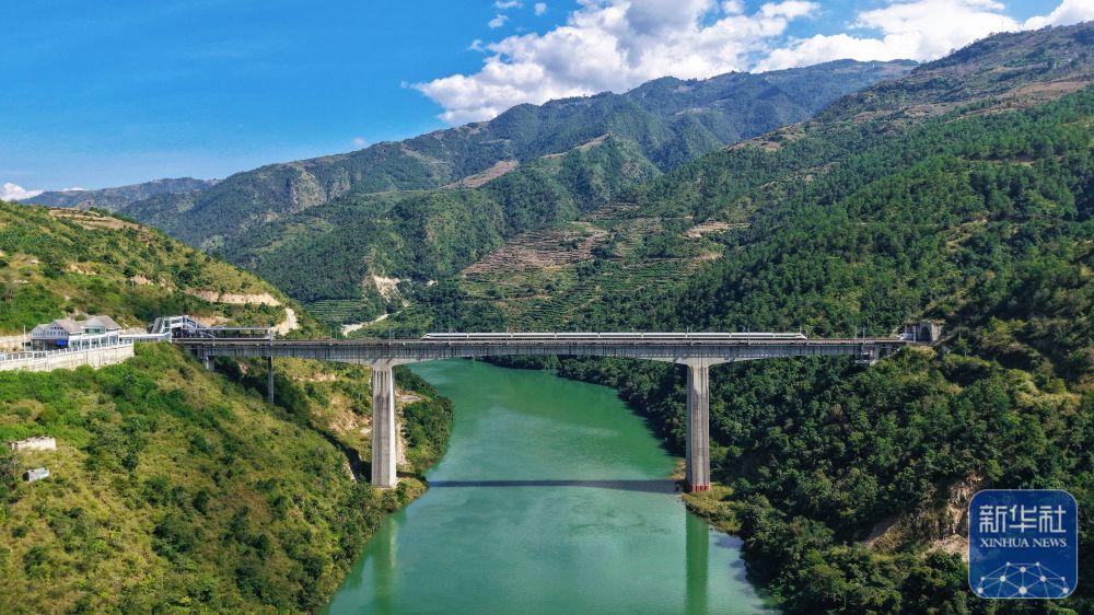 ↑ 10月30日,一列動(dòng)車組列車經(jīng)過小灣東站(無人機(jī)照片)。