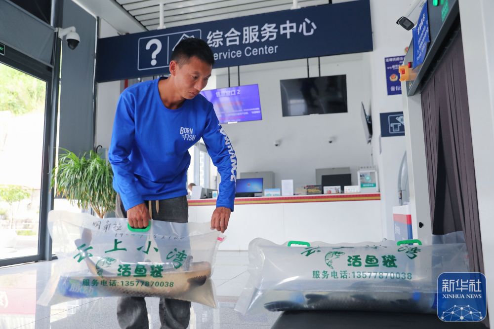 ↑ 10月31日,工作人員將裝袋、加氧后的小灣東鎮(zhèn)生態(tài)江魚放上安檢設(shè)備,準(zhǔn)備通過高鐵動(dòng)車運(yùn)往昆明。
