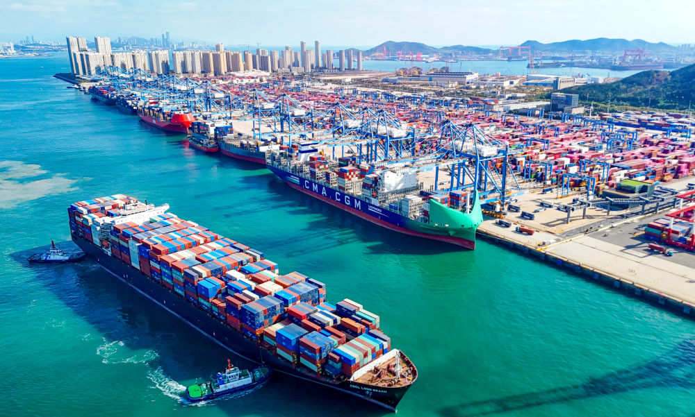 一艘貨輪滿載貨物駛出青島自貿(mào)片區(qū)(2025年11月5日攝,無人機照片)。新華社發(fā)(張進剛攝)