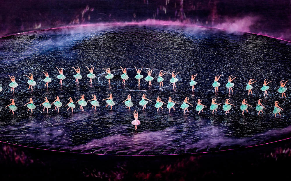 郎昆介紹,開幕式在空間敘事、藝術(shù)表達(dá)等方面都體現(xiàn)了三地文化交融。主舞臺直觀呈現(xiàn)“同心圓”造型,環(huán)形舞臺周邊是廣闊的水面,運(yùn)用前沿的“虛實(shí)結(jié)合”技術(shù),讓珠江、維多利亞港、伶仃洋的水波在場地中交匯奔流。這不僅是地理水系的相連,更是三地同源共流的文化血脈與手足親情的象征。