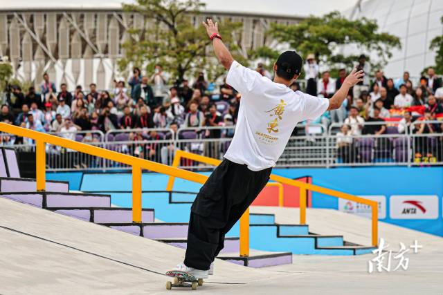 11月11日下午,十五運(yùn)會滑板項(xiàng)目男子街式?jīng)Q賽,廣東隊(duì)潘家杰完成高難度動(dòng)作后展開雙臂與歡呼的觀眾們互動(dòng)。鄭新洽 攝