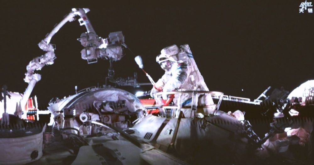 這是9月25日晚在北京航天飛行控制中心屏幕上拍攝的神舟二十號乘組航天員王杰在空間站組合體艙外作業(yè)的畫面。新華社記者李明剛 攝