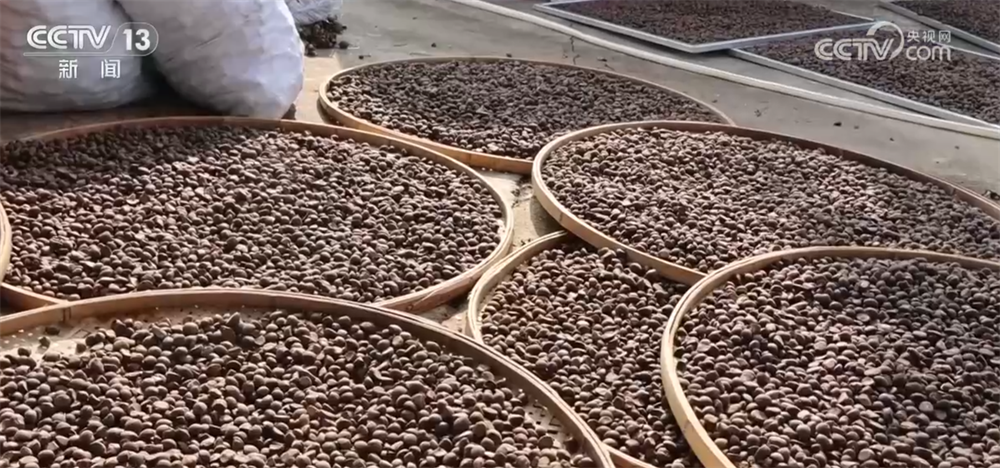 飽滿的油茶果壓彎枝頭,采摘工人們利用便攜式采收機(jī)穿梭林間,機(jī)器帶動樹枝高頻振動,一個(gè)個(gè)油茶果便紛紛脫落到鋪設(shè)好的采收網(wǎng)中。