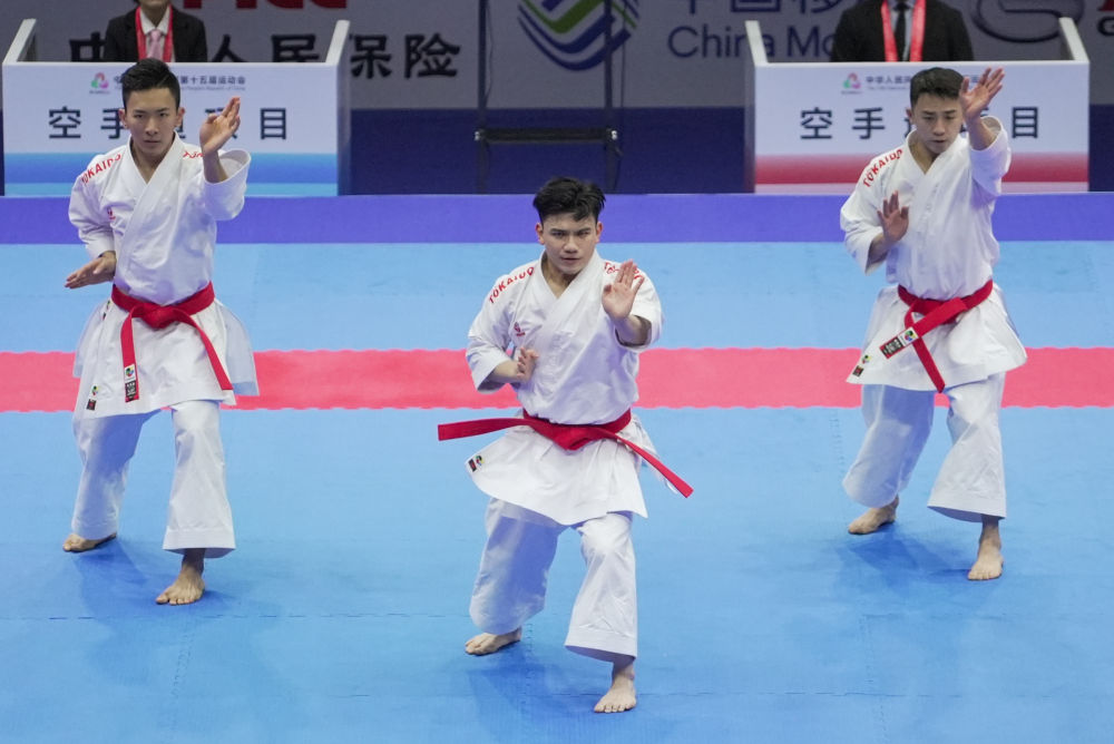 2025年11月6日,澳門(mén)代表隊(duì)在澳門(mén)舉行的第十五屆全國(guó)運(yùn)動(dòng)會(huì)群眾比賽項(xiàng)目空手道男子業(yè)余組團(tuán)體型半決賽中。新華社發(fā)