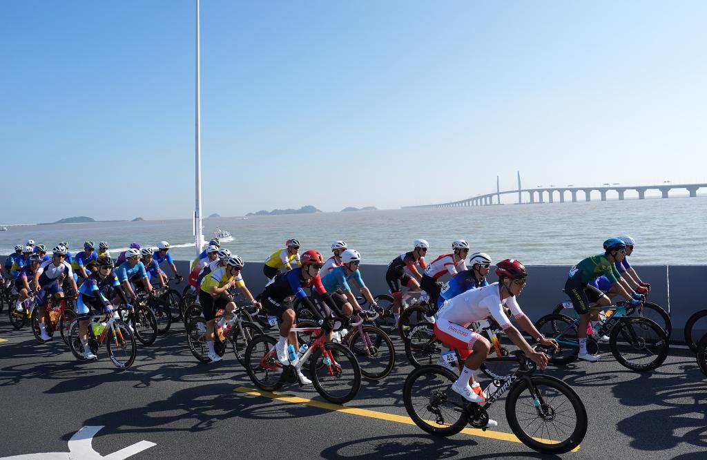 ↑11月8日,第十五屆全國(guó)運(yùn)動(dòng)會(huì)公路自行車男子個(gè)人賽決賽開賽,全程231.8公里,選手將經(jīng)過港珠澳大橋,跨越粵港澳三地。新華社記者 顏麟蘊(yùn) 攝