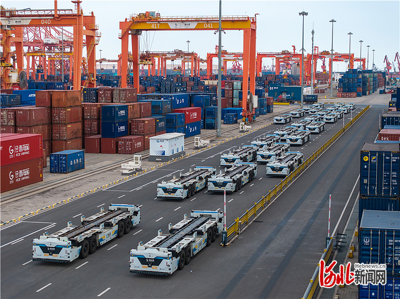 近日,唐山港京唐港區(qū),集裝箱碼頭堆場上智能平板運輸車整裝待發(fā)。 河北日報記者趙杰攝