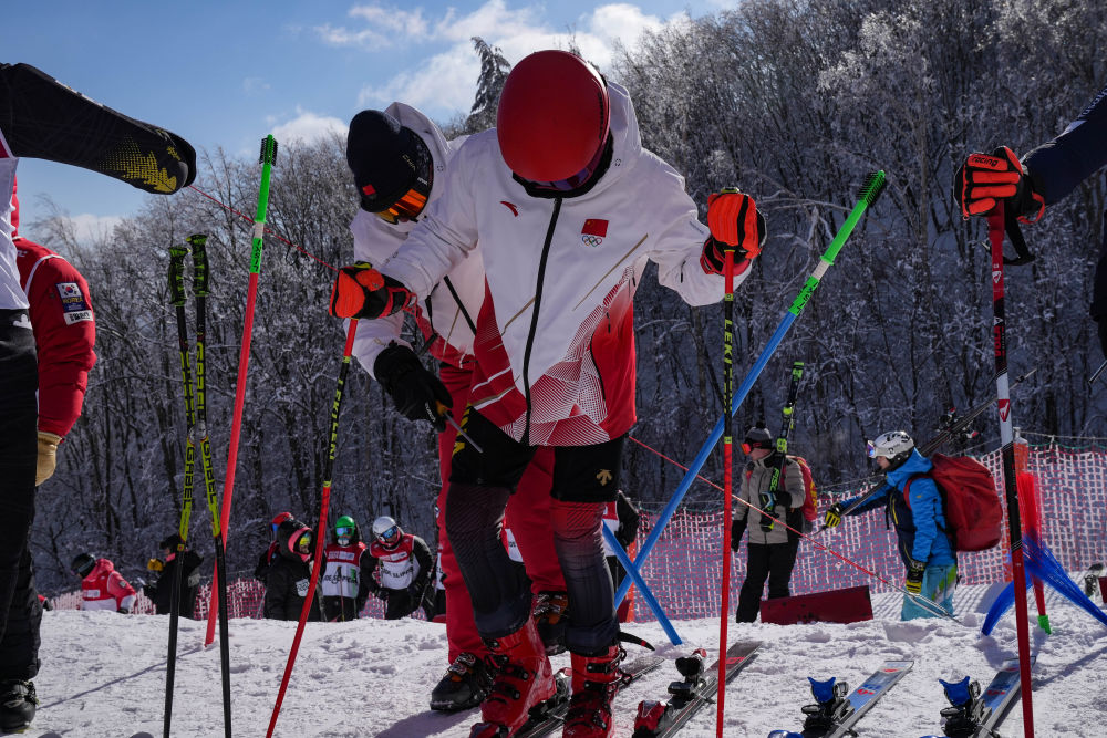 2024年1月24日,教練艾利夫(左)與中國選手王帥(右)在江源道冬青奧會高山滑雪比賽前。新華社記者 張笑宇 攝