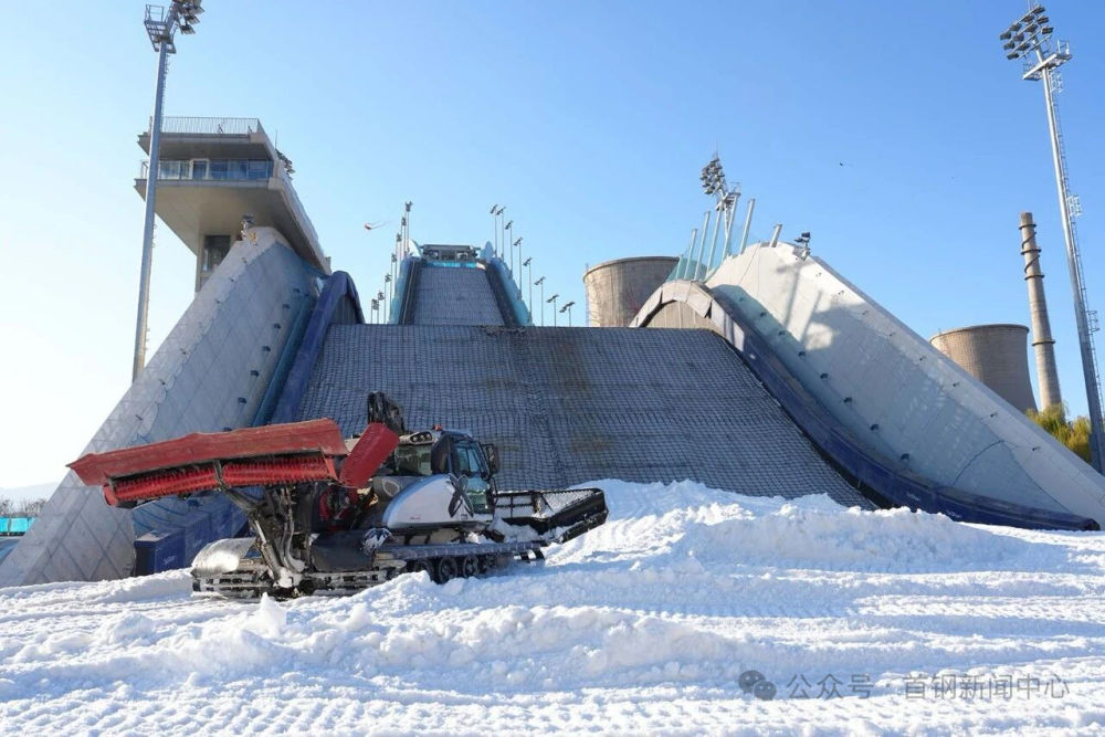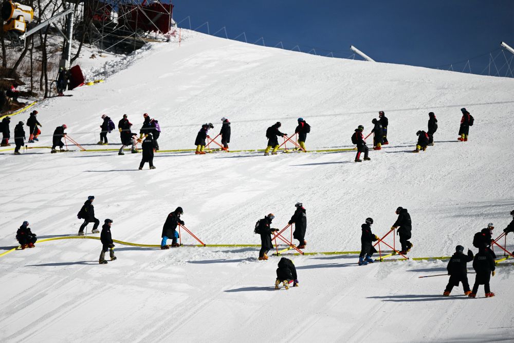 2022年1月28日,工作人員在國家高山滑雪中心雪道上進行冰狀雪制作。新華社記者 張晨霖 攝