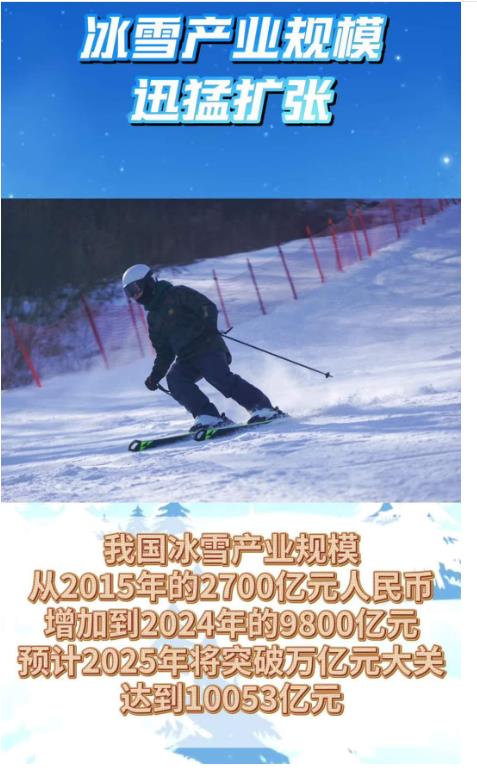 我國冰雪產(chǎn)業(yè)規(guī)模從2015年的2700億元人民幣增加到2024年的9800億元,預計2025年將突破萬億元大關,達到10053億元。