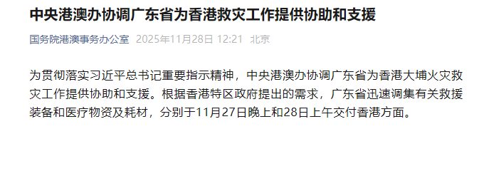 為貫徹落實習(xí)近平總書記重要指示精神,中央港澳辦協(xié)調(diào)廣東省為香港大埔火災(zāi)救災(zāi)工作提供協(xié)助和支援。根據(jù)香港特區(qū)政府提出的需求,廣東省迅速調(diào)集有關(guān)救援裝備和醫(yī)療物資及耗材,分別于11月27日晚上和28日上午交付香港方面。