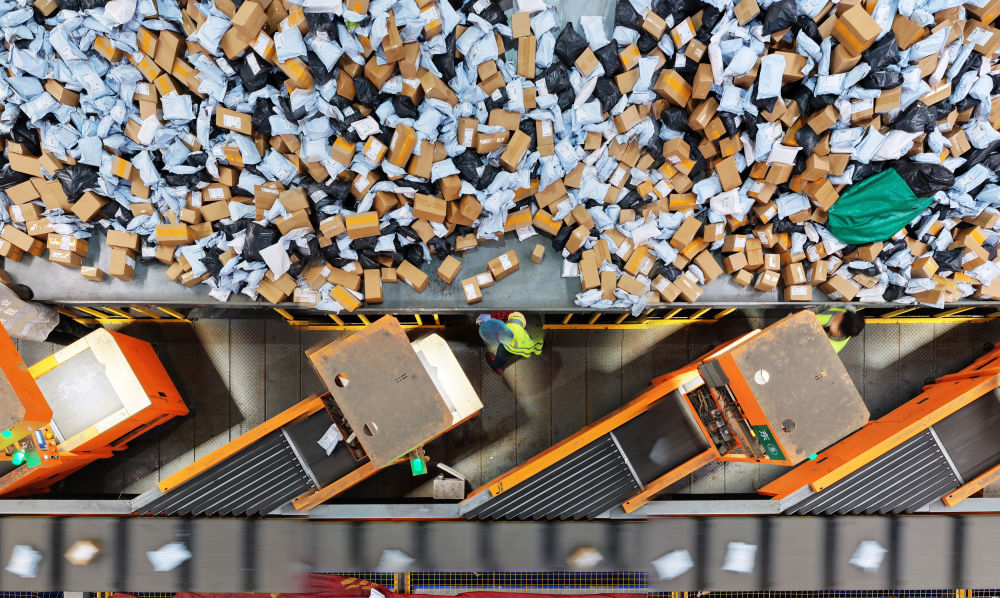 2025年11月10日,在中國郵政集團(tuán)有限公司江蘇揚(yáng)州郵件處理中心,工作人員分揀快遞包裹(無人機(jī)照片)。新華社發(fā)(孟德龍攝)