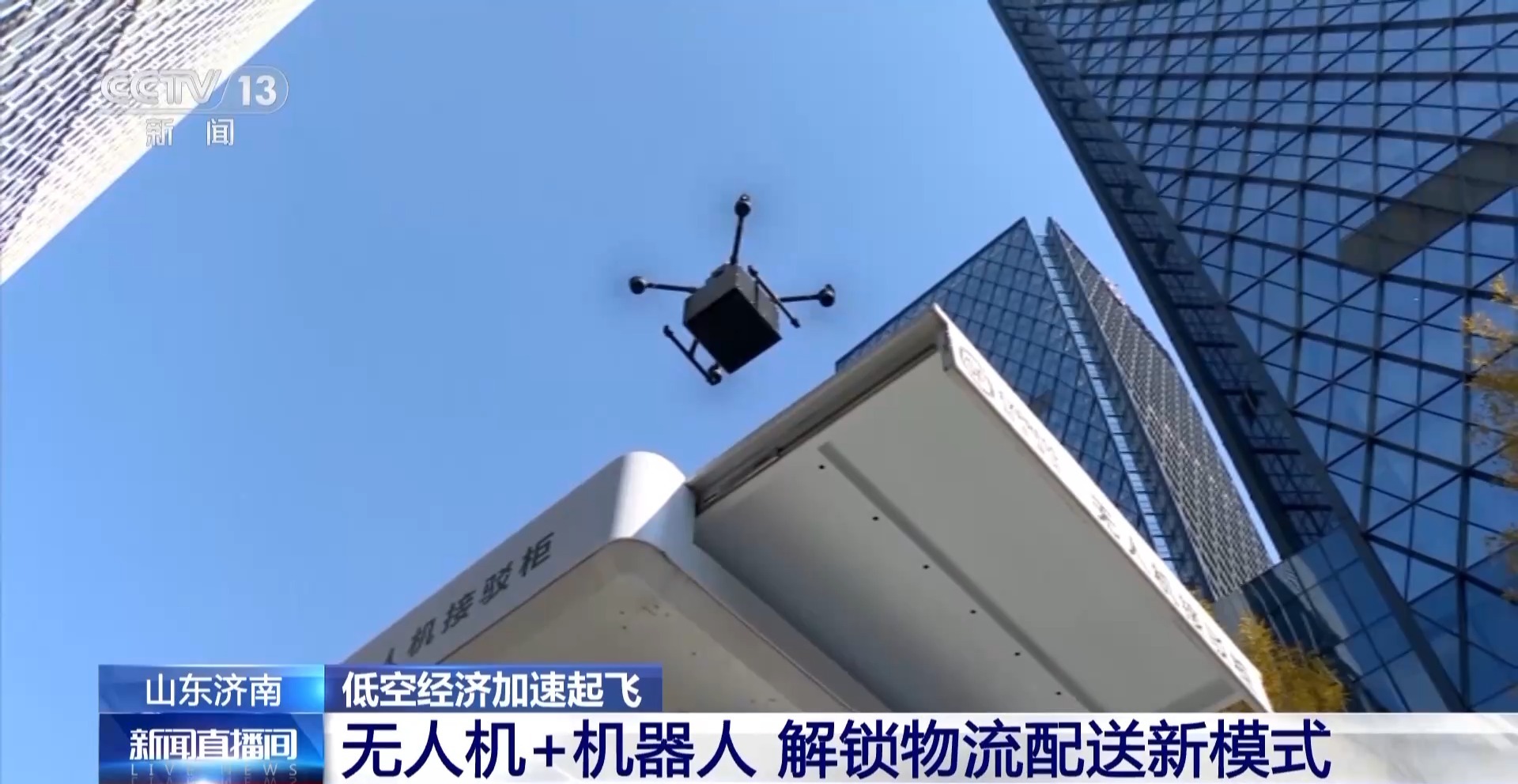 12月5日上午,一架最大載重10公斤的無人機(jī)從濟(jì)南中央商務(wù)區(qū)的高層建筑群中起飛。原本地面車輛需行駛15分鐘的路程,這架無人機(jī)沿著預(yù)定航線僅用7分鐘便到達(dá)目的地,平穩(wěn)降落在某大廈的停機(jī)坪上。隨后快件被取出,由一臺(tái)機(jī)器人接手,直接送到收件人手中。