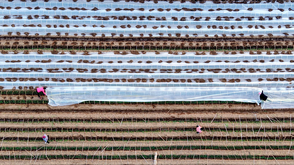 12月11日,在山東省臨沂市平邑縣地方鎮(zhèn),村民為種植的蔬菜幼苗覆蓋保溫薄膜(無人機(jī)照片)。 新華社發(fā)(武紀(jì)全攝)
