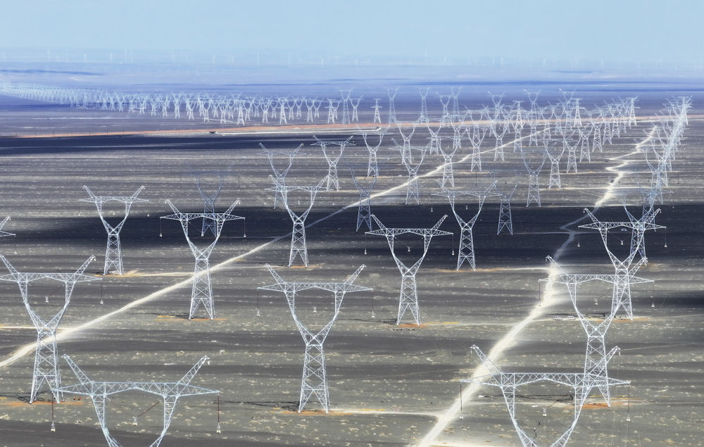 這是2025年4月24日在新疆哈密地區(qū)三塘湖鎮(zhèn)附近拍攝的“疆電入渝”特高壓工程(無(wú)人機(jī)照片)。新華社記者 王菲 攝