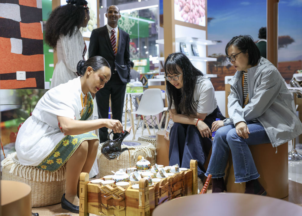 2025年11月7日,人們?cè)诘诎藢眠M(jìn)博會(huì)國(guó)家展埃塞俄比亞館品嘗咖啡。新華社記者 孟晨光 攝