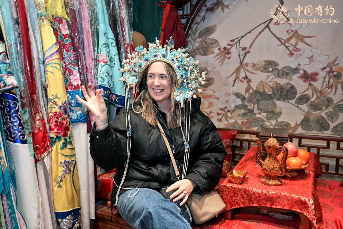 外籍友人體驗(yàn)戲曲鳳冠。