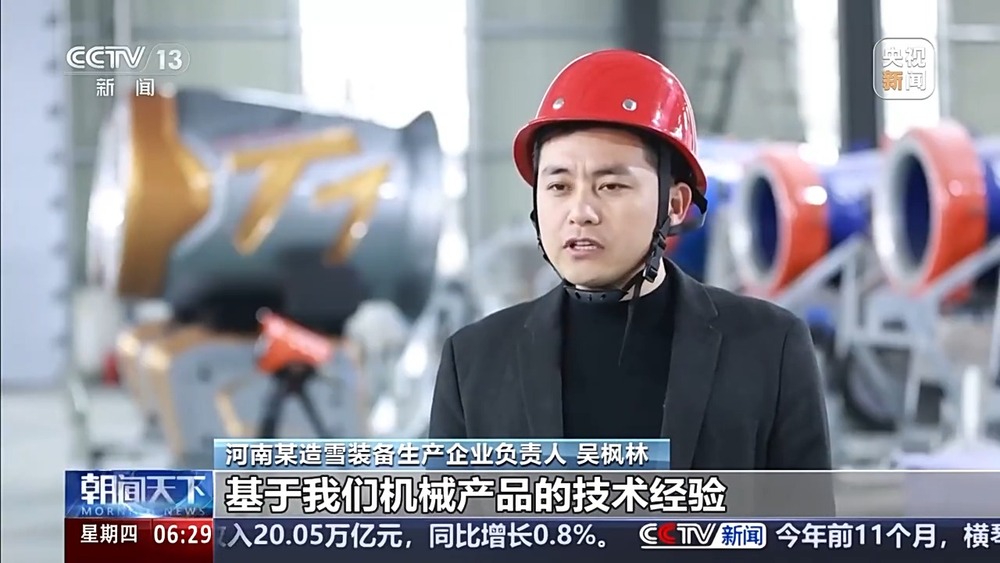 河南某造雪裝備生產(chǎn)企業(yè)負(fù)責(zé)人 吳楓林:南方地區(qū)很多都在零上的溫度,傳統(tǒng)的造雪機(jī)只有在零下才能造雪,這個(gè)飄雪機(jī),在零上30℃以下都可以飄雪花,每天基本上能造12立方米的雪。