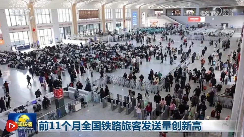 央視網(wǎng)消息(新聞聯(lián)播):記者從國(guó)鐵集團(tuán)獲悉,今年1至11月,全國(guó)鐵路發(fā)送旅客42.8億人次,同比增長(zhǎng)6.6%,創(chuàng)歷史同期新高。