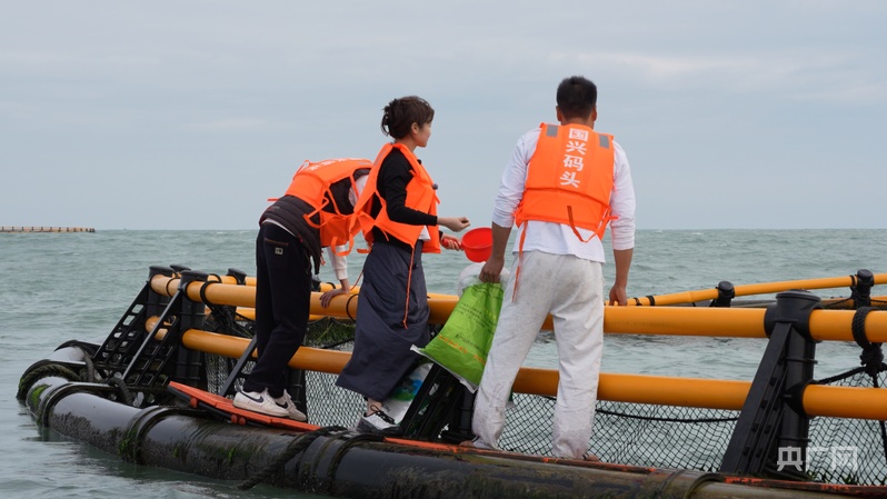 記者(中)在海洋牧場(chǎng)體驗(yàn)飼料投喂(央廣網(wǎng)記者 張順鵬 攝)