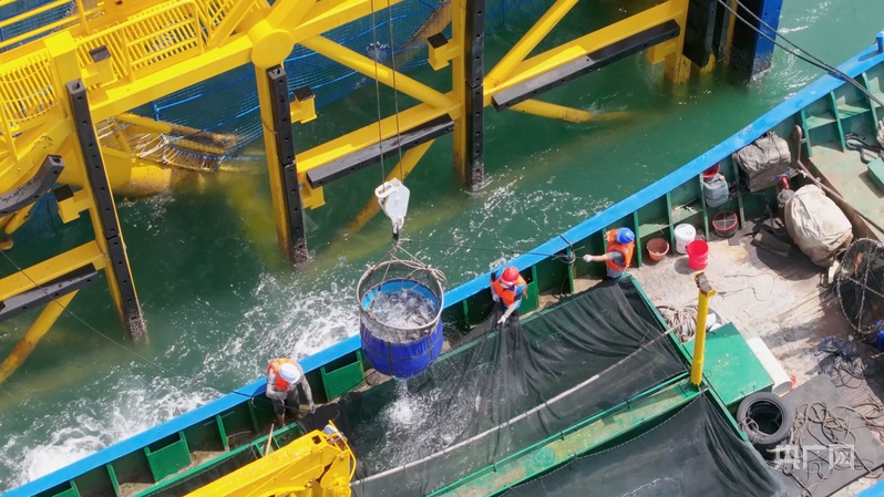 “龍宮號(hào)”工作人員將魚(yú)打撈上船(央廣網(wǎng)記者 徐鋇兒 攝)