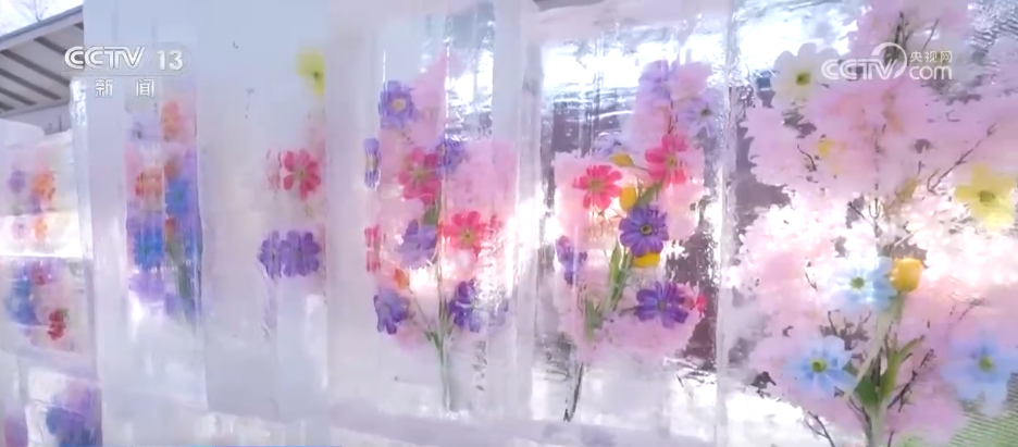 看完了霧凇,剛才說(shuō)到的冰雕在哪里呢?大家看這面鮮花冰墻就是進(jìn)入冰雕觀賞區(qū)的標(biāo)志:它以冰塊為載體,嵌入了青海本土的郁金香、格?;ǎ€有西寧市花丁香花,嬌艷色彩與冰晶的純凈相互映襯。