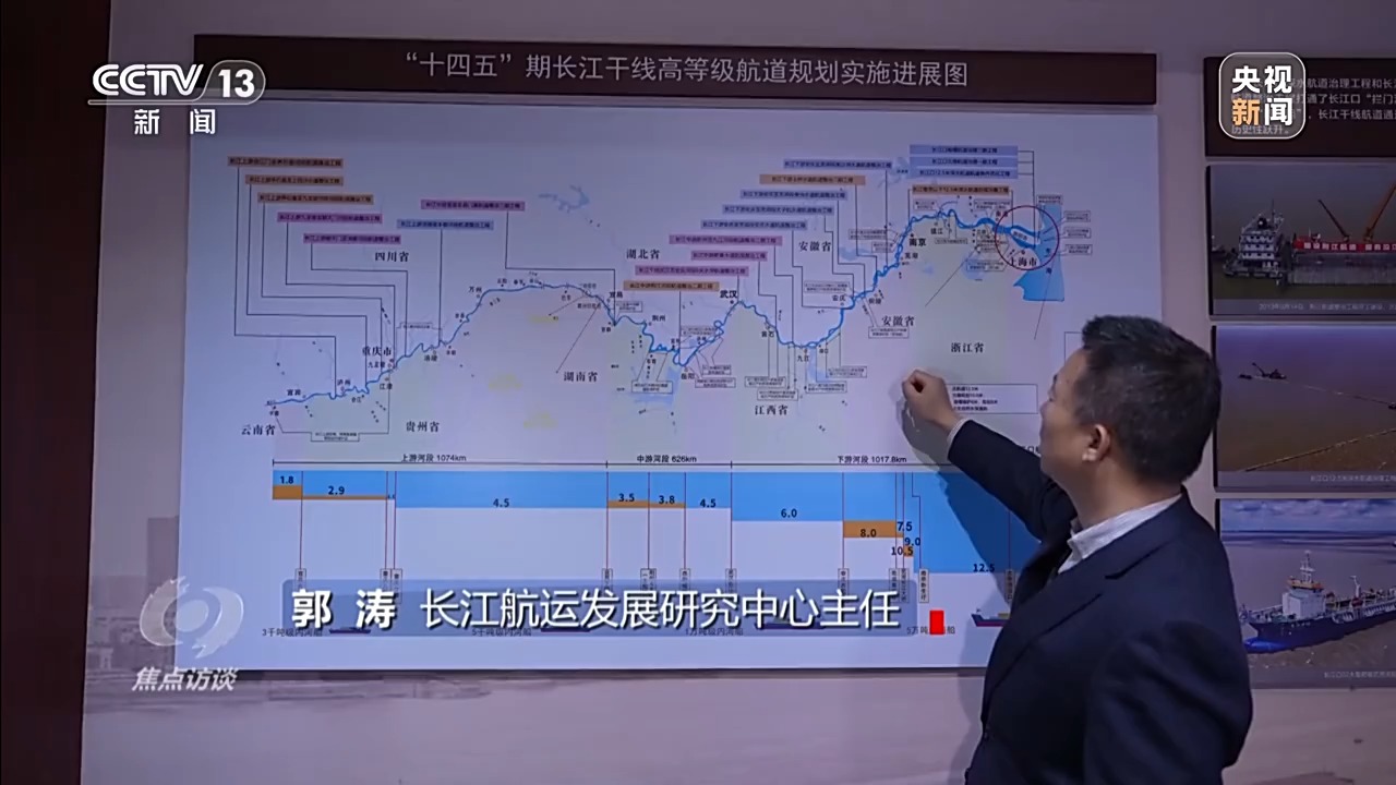 郭濤:十年前,因?yàn)榫植康亩曼c(diǎn)卡點(diǎn),航道標(biāo)準(zhǔn)不能統(tǒng)一,水深沒法貫通起來。通過十年的整治和疏浚,水深明顯提升了,可以通航的船舶更大了,物流成本就更低了。
