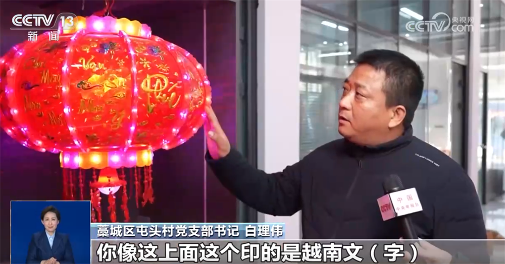 藁城區(qū)屯頭村黨支部書記 白理偉:通過宮燈博覽會(huì),對(duì)接了市場、增加了客戶,你像這個(gè)上面印的是越南文字,一些吉祥話,這是近兩年新開發(fā)的產(chǎn)品。
