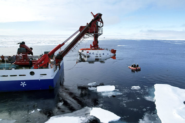 2025年8月11日,“蛟龍”號(hào)在北極冰區(qū)準(zhǔn)備下潛。新華社記者 劉詩(shī)平 攝