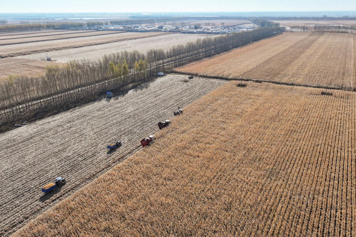 2024年10月16日,在黑龍江省肇東市五里明鎮(zhèn)東升村,農(nóng)民駕駛農(nóng)機(jī)進(jìn)行收割作業(yè)(無(wú)人機(jī)照片)。新華社記者 謝劍飛 攝