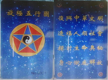 “乾源文化”非法組織銷售的“旋極五行”圖卡,聲稱此卡“具有宇宙能量”,可以幫助學員提升自我