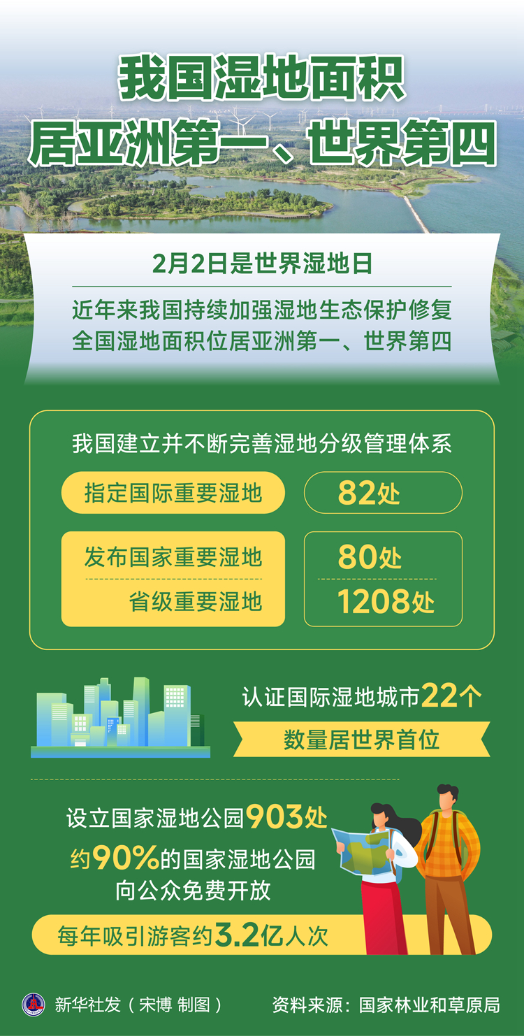 2月2日是世界濕地日。記者當天從國家林業(yè)和草原局獲悉,近年來我國持續(xù)加強濕地生態(tài)保護修復,全國濕地面積位居亞洲第一、世界第四,濕地保護形成重點治理和分類保護相結合的新格局。