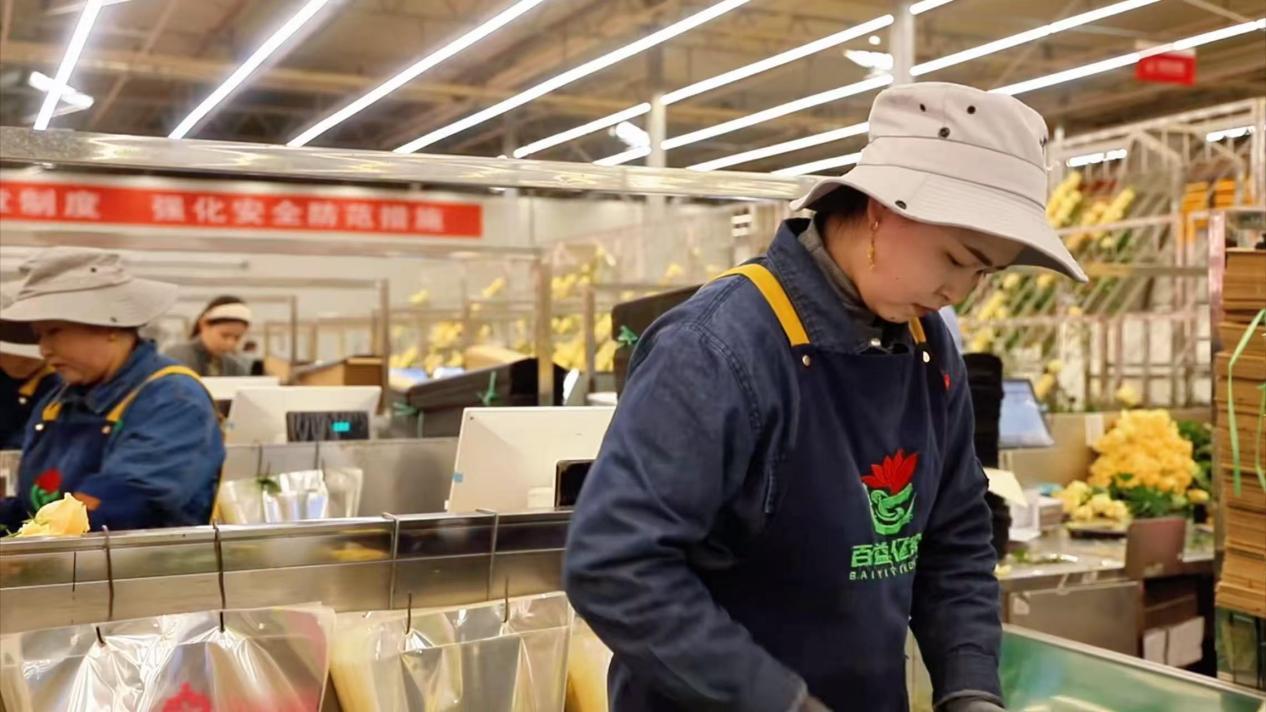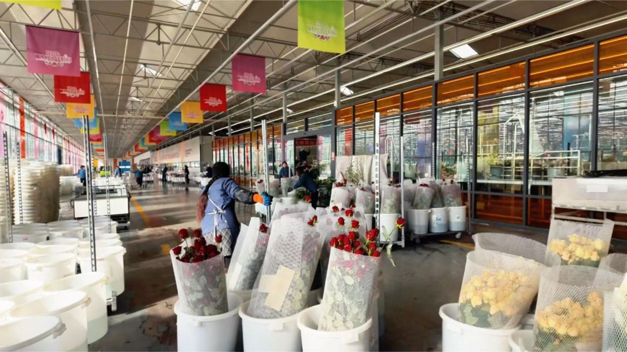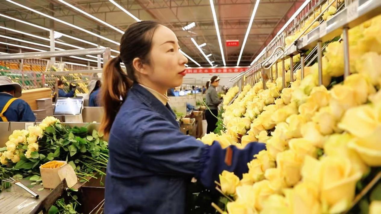 張婷婷在車間熟練地分揀玫瑰