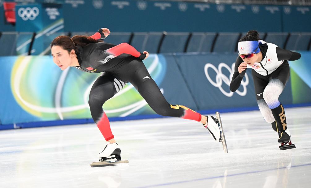 2月5日,中國運(yùn)動(dòng)員韓梅(左)和日本運(yùn)動(dòng)員高木美帆在訓(xùn)練中。新華社記者 武巍 攝