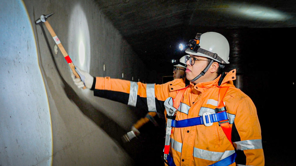 橋體間的縫隙狹窄,進(jìn)入大橋內(nèi)部后更是伸手不見五指。上海高鐵基礎(chǔ)設(shè)施段湖州車間橋梁組工作人員借著頭燈的光線,像啄木鳥為樹木問診一般,沿梁體一路進(jìn)行聽診式的檢查。
