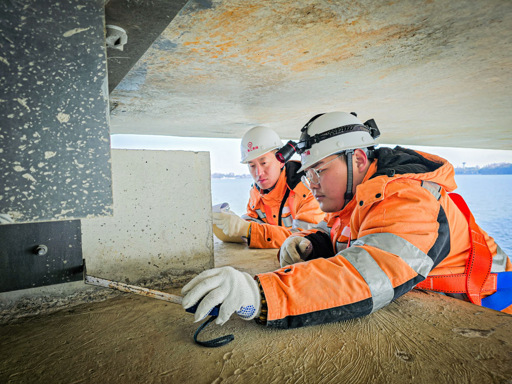 春運(yùn)期間,上海高鐵基礎(chǔ)設(shè)施段湖州車間橋梁組工作人員在滬蘇湖高鐵元蕩湖段進(jìn)行檢修作業(yè)。