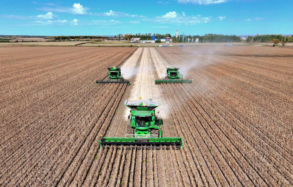 2025年9月29日,在北大荒集團黑龍江尾山農(nóng)場有限公司第一管理區(qū),農(nóng)機進行大豆收獲作業(yè)(無人機照片)。新華社發(fā)(陸文祥攝)