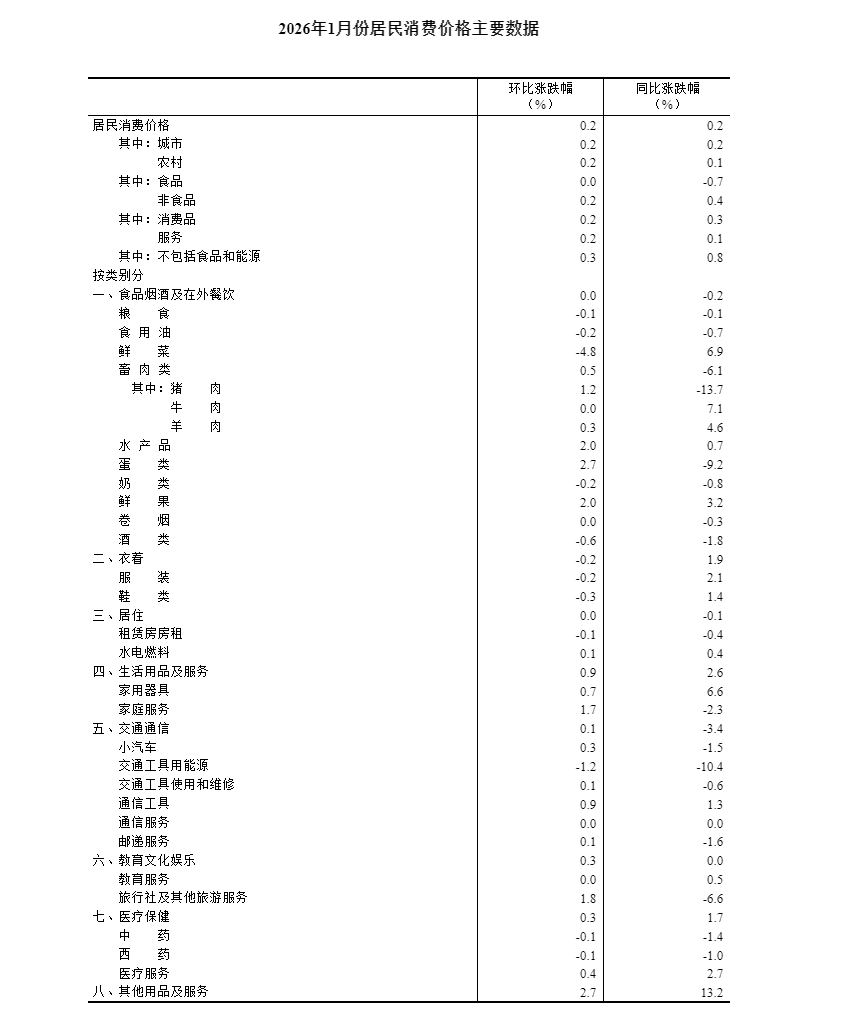 2026年1月份,全國居民消費價格同比上漲0.2%。其中,城市上漲0.2%,農村上漲0.1%;食品價格下降0.7%,非食品價格上漲0.4%;消費品價格上漲0.3%,服務價格上漲0.1%。