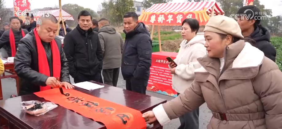 在江西上饒市廣信區(qū)尊橋鄉(xiāng),年貨市集人頭攢動。攤位上年貨品類豐富,當?shù)氐臅◥酆谜攥F(xiàn)場寫春聯(lián)、送福字,墨香四溢。