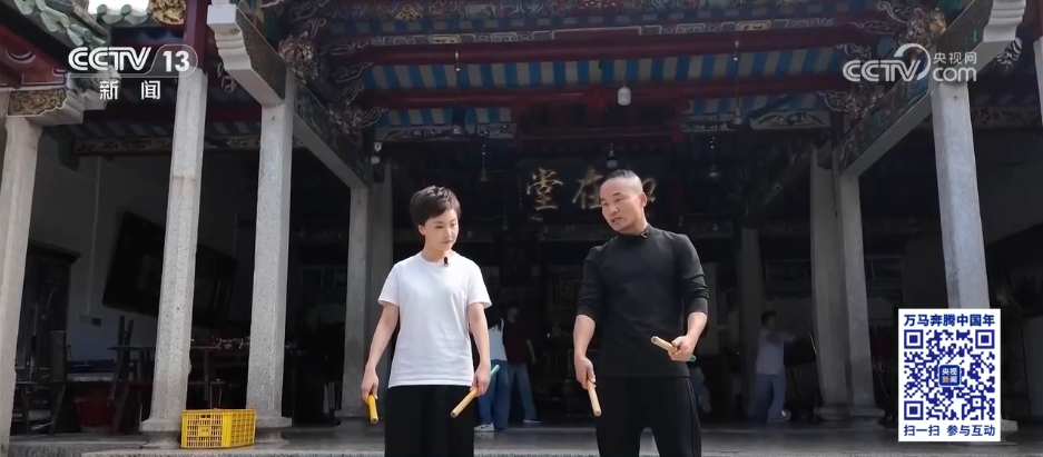 總臺記者趙宇昕找到了普寧富美青年英歌隊總教練李俊浩,趙宇昕說:“李教練,我是您失散多年的徒弟。我總是看您在英歌舞里面跳關(guān)勝那個角色,動作非常鼓舞人心,今天特意找您學(xué)一學(xué)英歌舞?!?/p>